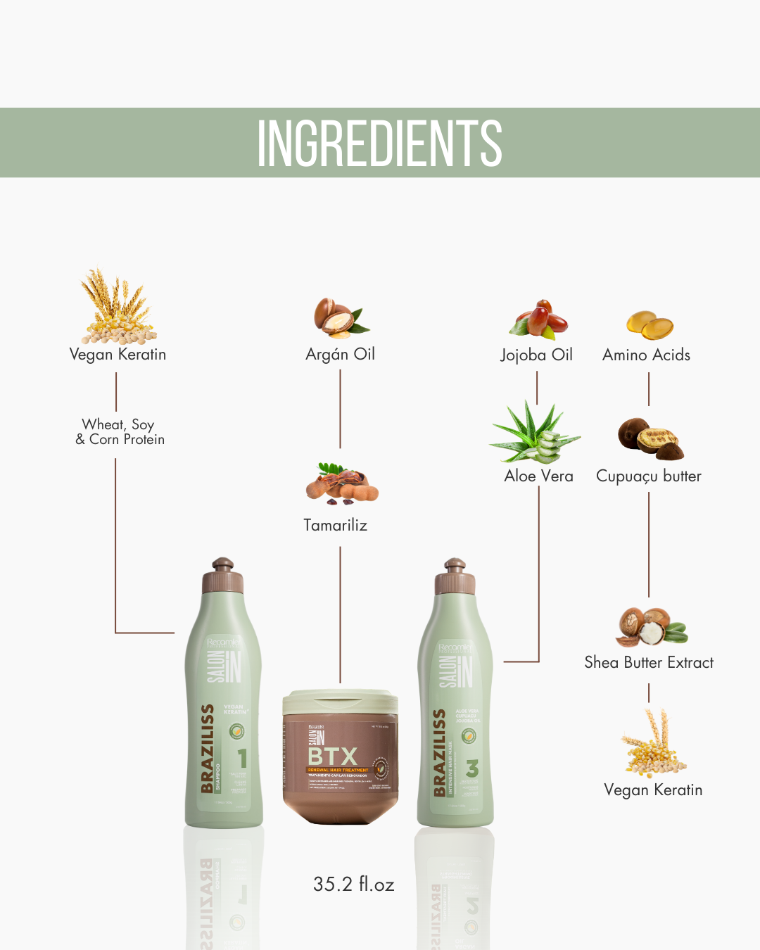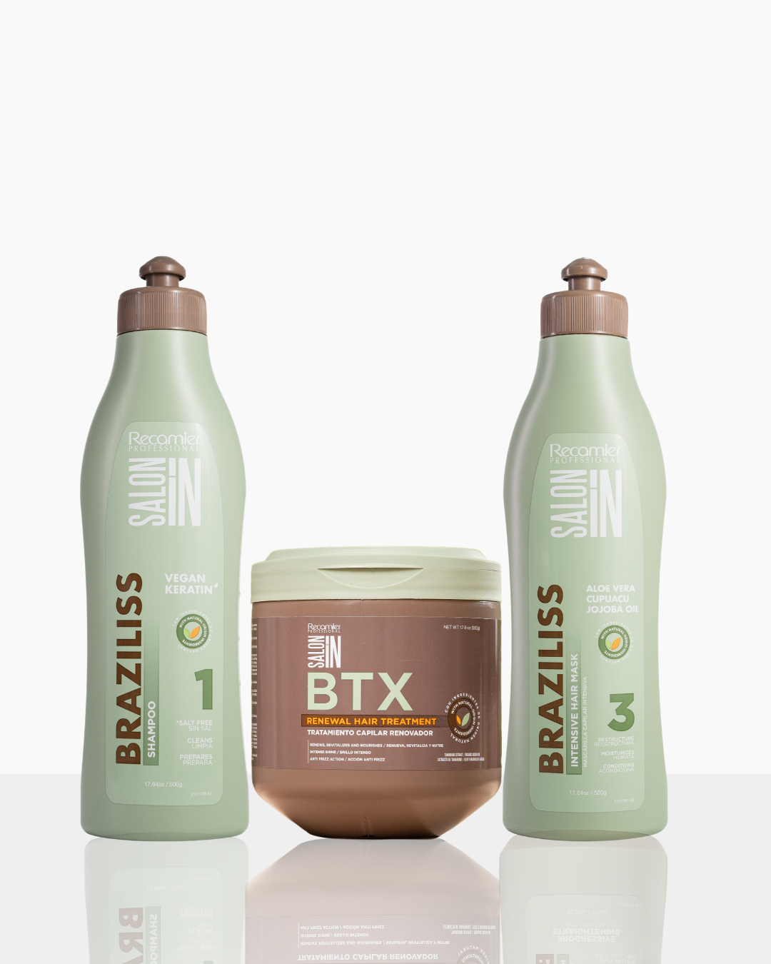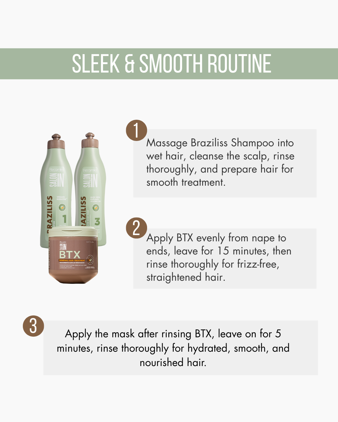 This 3-step professional combo combines the deep cleansing power of Braziliss Step 1 with the fiber-renewing action of BTX Mask, followed by the cuticle-sealing nourishment of Braziliss Step 3 Intensive Mask.