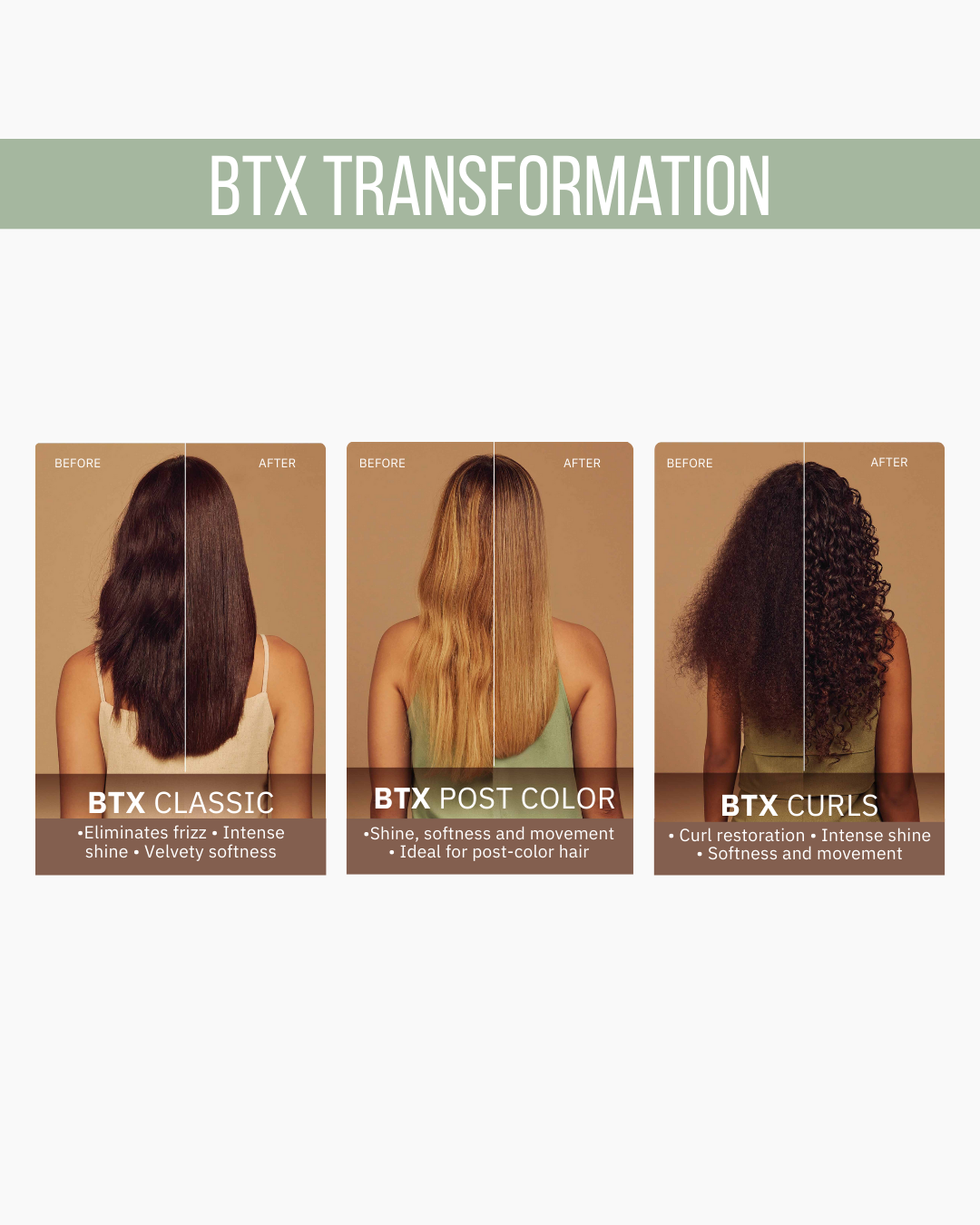 After BTX, apply mid-length to ends to seal the cuticle and restore moisture. Leave on 5–10 minutes and rinse.